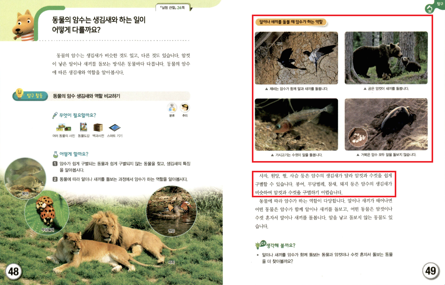암수 역할의 다양함은 교과서 49쪽에 사진과 함께