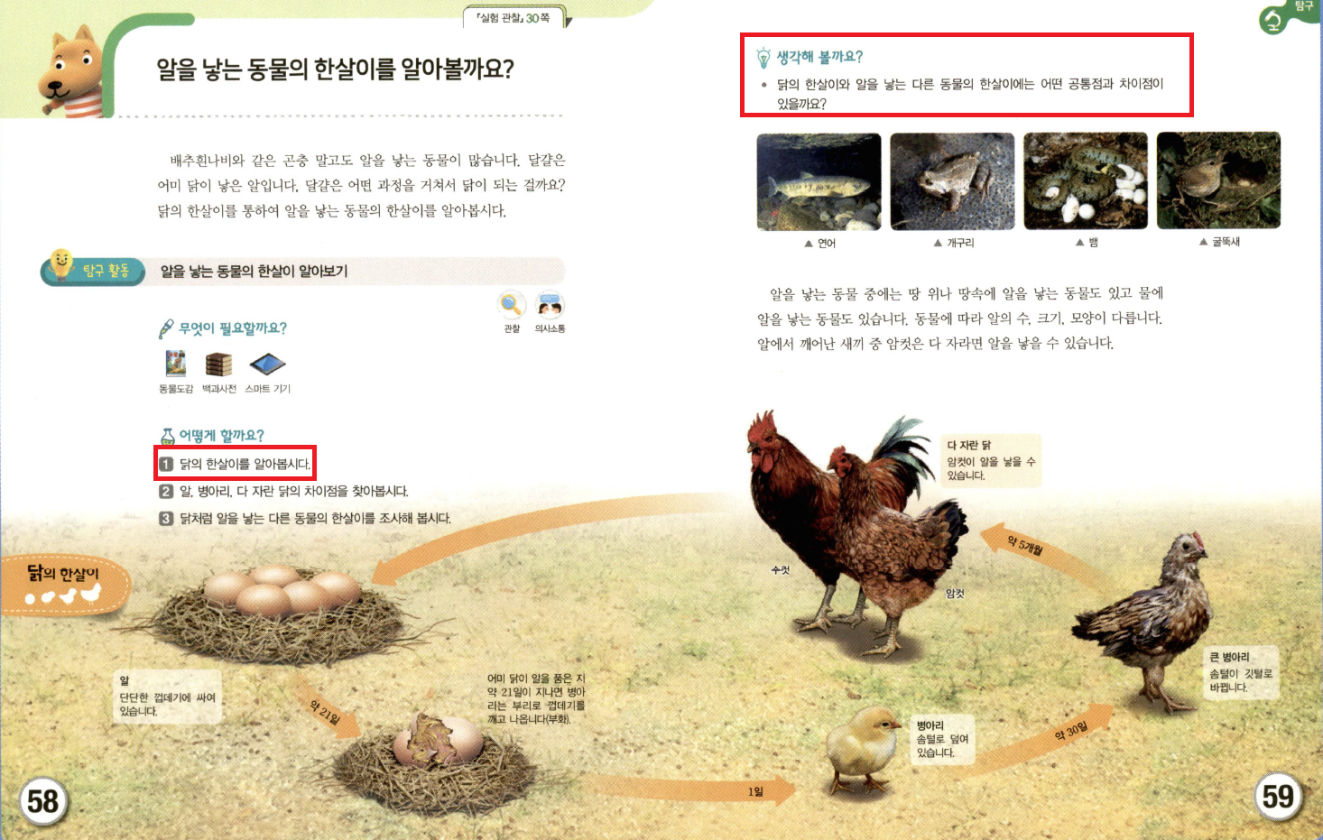 교과서 58~59쪽, 실험관찰 30쪽은 알을 낳는 동물의